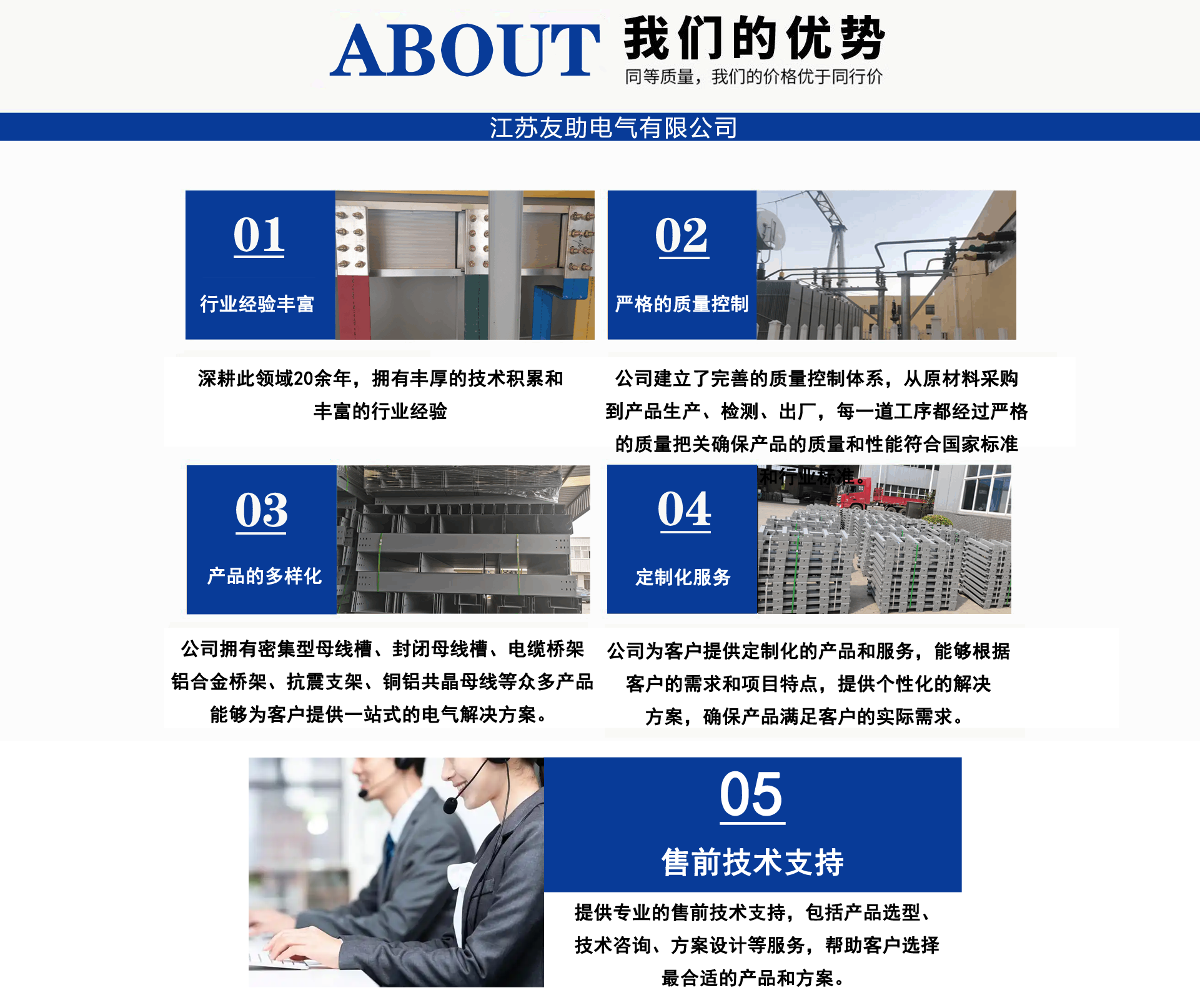 江蘇友助電氣有限公司地處中國工程電氣生產(chǎn)基地-一江蘇省揚(yáng)中市。經(jīng)營范圍:電纜橋架,母線槽(橋),管型母線,銅軟連接(伸縮節(jié)),高低壓開關(guān)柜,配電箱,抗震支架產(chǎn)品系列。 公司宗旨:客戶至上。已成功為江蘇二十屆省運(yùn)會(huì)會(huì)場-泰州體育館,南京寶龍商業(yè)綜合體,張家口百兆瓦風(fēng)電場,濟(jì)源市婦幼醫(yī)院,威海市未來科技園,湖北皇恩燁新材料科技有限公司,南京中央路小學(xué),南通中天大酒店,新疆新安特鋼有限公司,河北省送變電有限公司,南京南微醫(yī)學(xué)研發(fā)基地等多項(xiàng)工程配套服務(wù),我們愿與您精誠合作,互利共贏!公司技術(shù)人員深耕橋架,母線領(lǐng)域30年,為您提供橋架,母線槽疑難問題解決方案。母線槽不論每相是單排,雙排,三根排重疊,不管有多少個(gè)水平彎、垂直彎,轉(zhuǎn)接排在發(fā)貨前預(yù)裝一遍,確保尺寸無誤。到現(xiàn)場直接擰螺絲,效率高,橫平豎直,規(guī)規(guī)矩矩,符合標(biāo)準(zhǔn),供電局,業(yè)主,監(jiān)理,驗(yàn)收易通過。供貨周期3-7天。為了讓尊貴客戶您,設(shè)備安全通電,高枕無憂。我們提供如下售前售中售后服務(wù): 售前:免費(fèi)技術(shù)支持,咨詢。 售中:免費(fèi)現(xiàn)場精確測繪、設(shè)計(jì)。 售后:安裝服務(wù),免費(fèi)指導(dǎo)。 質(zhì)量是生命,客戶是源泉。承諾客戶的,一定全力做到。讓我們一起進(jìn)步!...